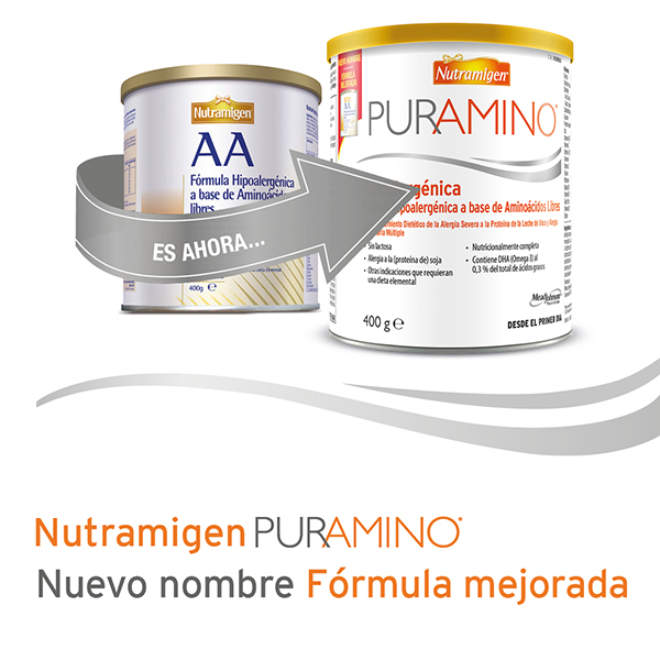 Nutramigen AA se llama ahora Nutramigen PURAMINO — un nombre nuevo y una fórmula mejorada para lactantes y niños con alergia severa a la proteína de la leche de vaca o alergia múltiple alimentaria y para los casos en que una FEH no es eficaz. Nutramigen PURAMINO es la misma fórmula con aminoácidos y una pureza del 100% eficaz y de confianza* [1] que Nutramigen AA, pero tiene ahora nuevos beneficios para usted y sus pacientes.